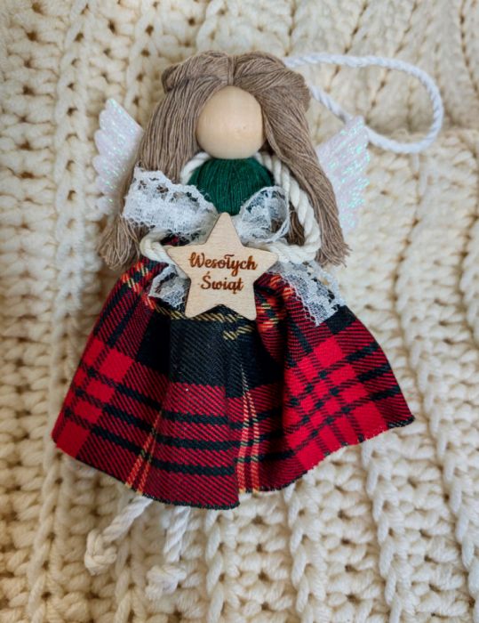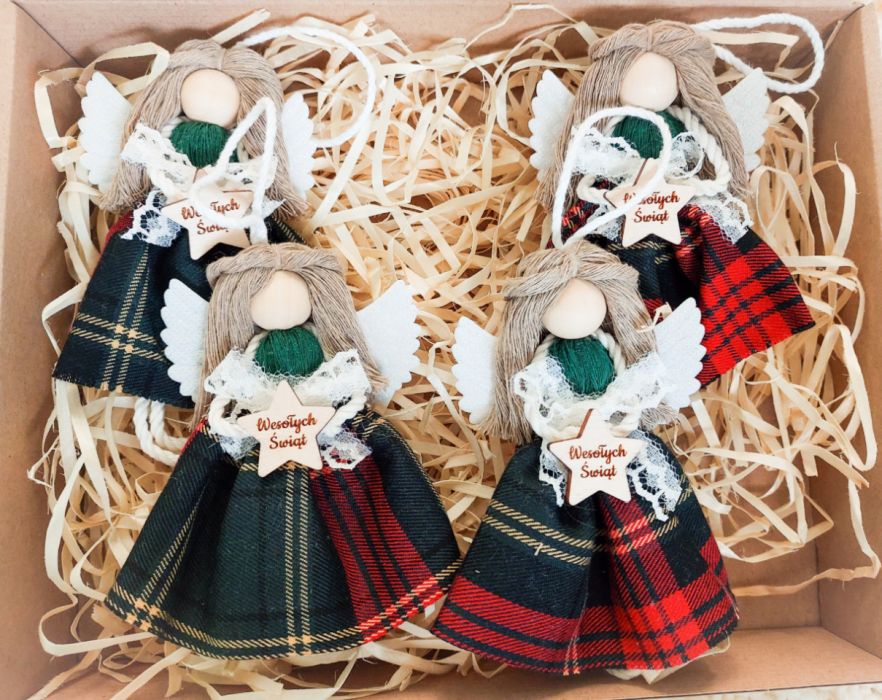 Komplet 4 ręcznie wykonanych aniołków ze sznurka, które idealnie nadają się do powieszenia na choinkę. Każdy z aniołków "ubrany" jest w sukienkę z motywem świątecznej kraty, posiada białe, brokatowe skrzydełka oraz sznurek ułatwiający powieszenie na choince. Całość uzupełniają drewniane gwiazdki z napisem "Wesołych świąt". Aniołki zapakowane w pudełku z wypełnieniem, dzięki czemu otrzymujemy samodzielny prezent na Mikołaja lub na święta. Istnieje możliwość dopięcia karteczki lub liściku do wpisania życzeń.