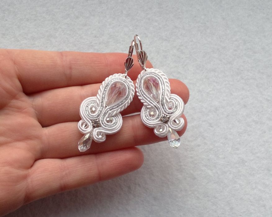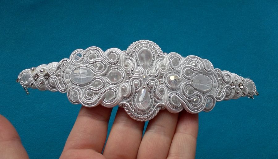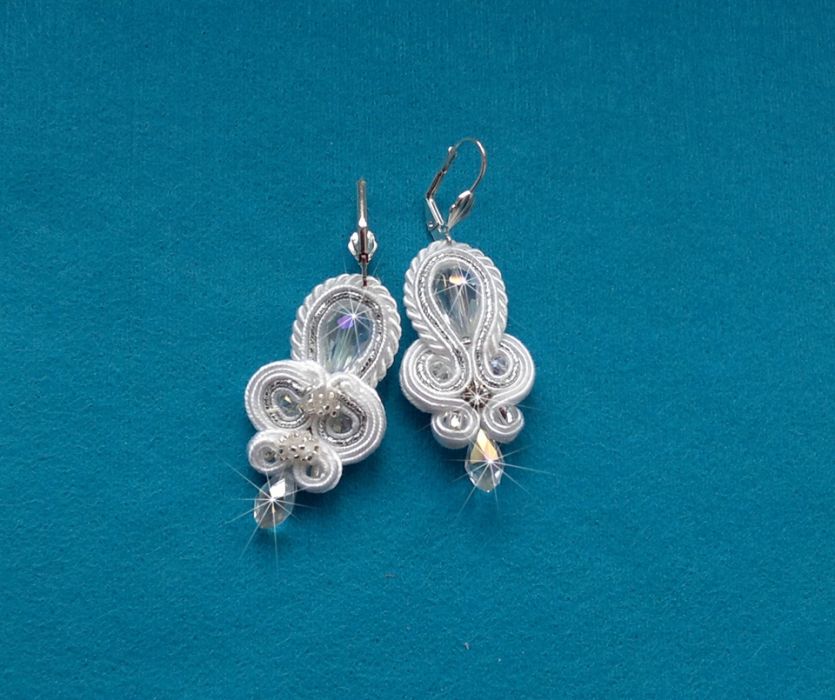 Szkło, Filc, Tkanina,szklane koraliki TOHO, fasetowane kryształy, sznurki sutasz w odcieniu białym i srebra metalizowanego