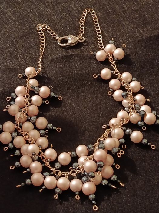 Komplet "Perełkowy świat" to bardzo pracochłonne dzieło. Powstało z połączenia ogromnej ilości jasnoróżowych perełek ( 8 mm) z drobnymi, szklanymi, granatowymi kryształkami. Bazą jest łańcuszek w kolorze srebrnym do którego doczepione są dziesiątki "zawieszek" na szpilkach jubilerskich, powstałych z połączenia perełki i koralików. W skład kompletu wchodzi naszyjnik, kolczyki i regulowana bransoletka.
