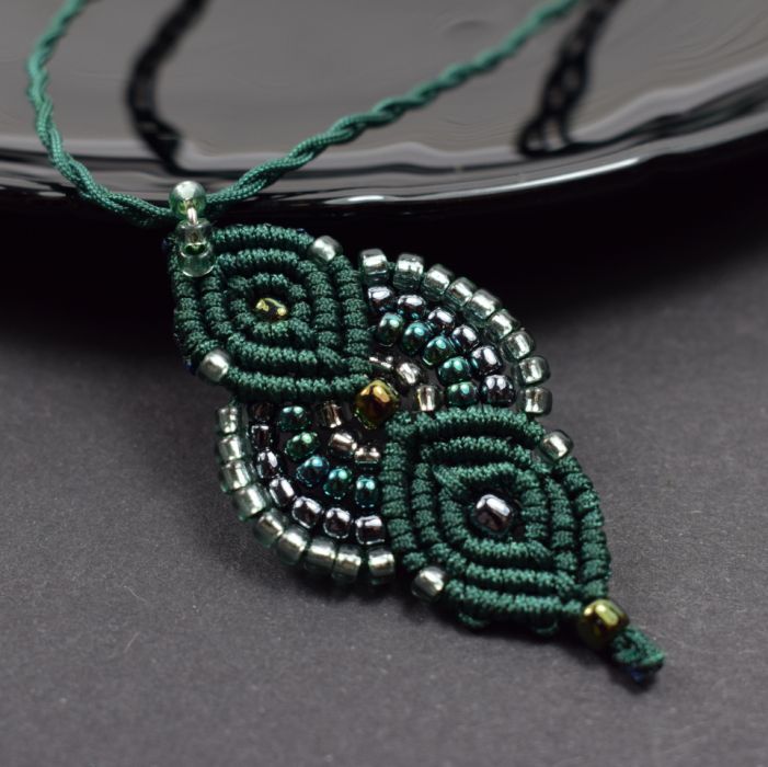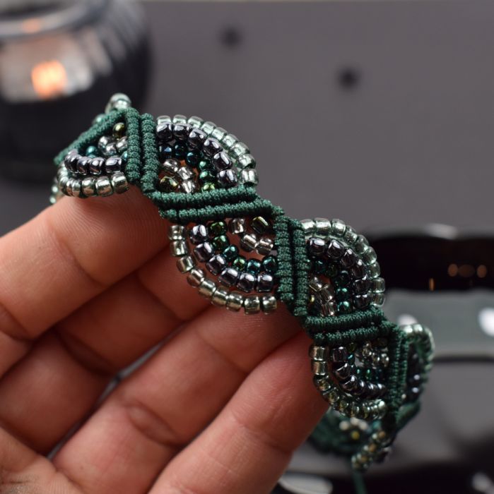 Ręcznie wykonany komplet biżuterii - naszyjnik i bransoletka - stworzony techniką makramy z profesjonalnego sznurka w kolorze głębokiej butelkowej zieleni. Każdy element został misternie wypleciony i ozdobiony drobnymi, lśniącymi koralikami w odcieniach srebra, szmaragdu i grafitu.