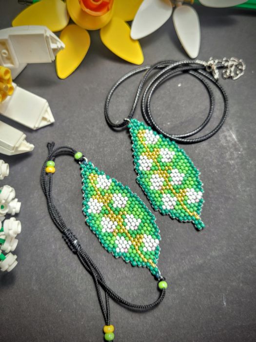 Przedmiotem sprzedaży jest unikalny zestaw biżuterii z koralików, inspirowany pięknem konwalii, został wytkany własnoręcznie na krosnie z wysokieJ jakości koralików czeskich Preciosa.