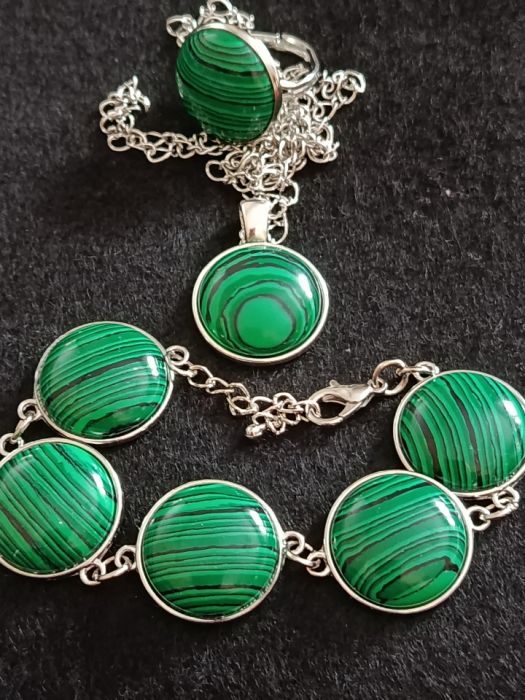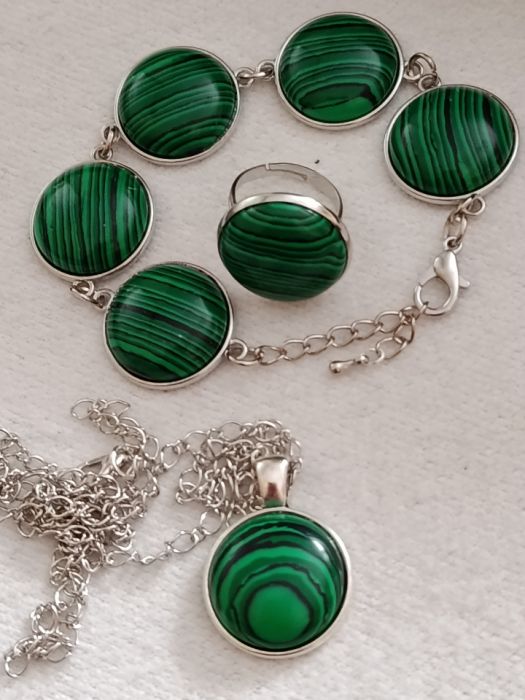 Komplet składa się z bransoletki, pierścionka i naszyjnika. Użyty kaboszon syntetycznego malachitu jest o średnicy 20 mm. Oprawa w kolorze srebrnym.