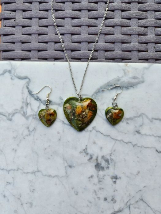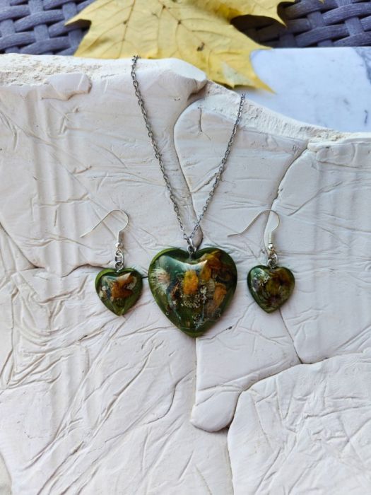 Zachwyć się naturalnym pięknem zamkniętym w sercu! Ten wyjątkowy komplet biżuterii składa się z delikatnych kolczyków oraz dopasowanego wisiorka, wykonanych z wysokiej jakości żywicy epoksydowej z zatopionymi suszonymi kwiatami. Każdy element tego kompletu to unikatowa biżuteria – niepowtarzalny, ręcznie wykonany dodatek, który podkreśli Twój styl i osobowość.
