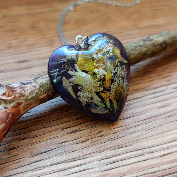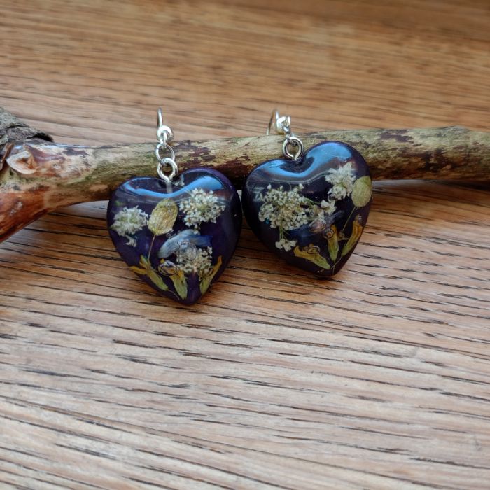 Komplet wisiorka i kolczyków z żywicy epoksydowej z zatopionymi kwiatami to biżuteria, która zatrzymuje czas i pozwala nosić przy sobie odrobinę natury zaklętą w szklanym blasku.