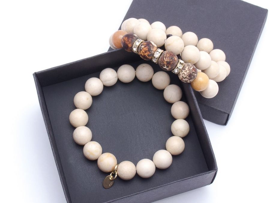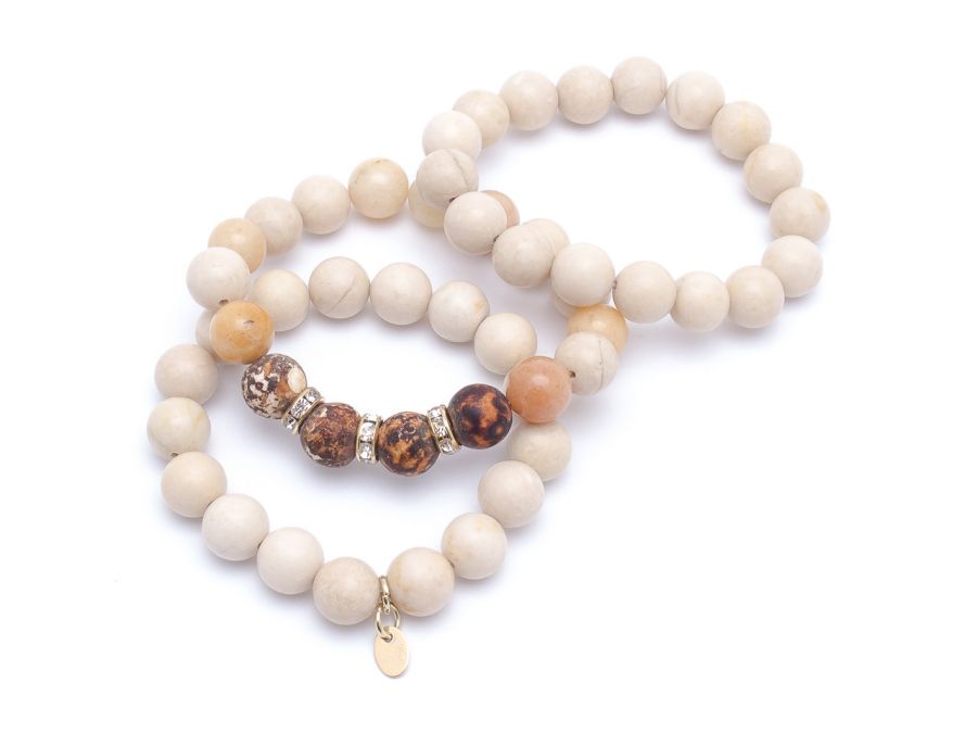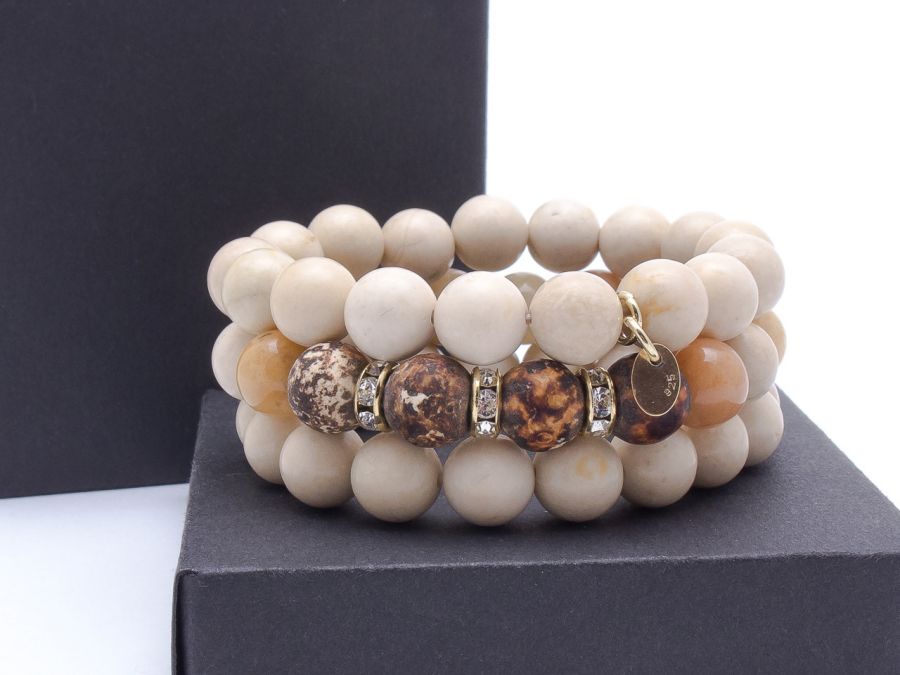 Zapraszam do zakupu kompletu bransoletek z kamieni naturalnych, jadeit fossil 10 mm, jadeit multikolor 10 mm, agat palony 10 mm, pozłacana blaszka próba 925.