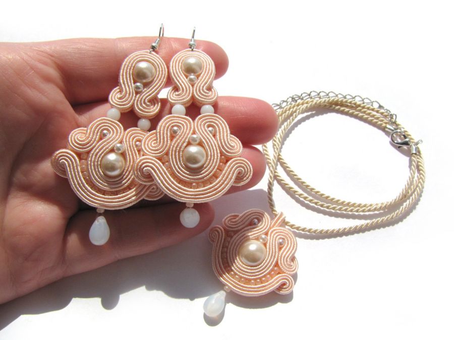 KOMPLET BIŻUTERII SUTASZ wykonany z najlepszej jakości sznureczków sutasz, szklanych perełek, koralików oraz elementów metalowych w kolorze srebra. Wisiorek zawieszony na beżowym sznureczku. Komplet podklejony cienkim filcem. Całość impregnowana co w znacznym stopniu zapobiega zabrudzeniom. Mogę do kompletu wykonać bransoletkę, ozdobę do włosów lub wykonać podobny w innych kolorach. Polecam...