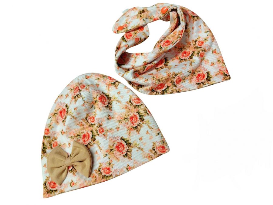 Czapka z podwójnej warstwy prążka z kokardką obwód głowy dopasowany do rozmiaru oraz chustka dwustronna mała zapinana na napy, wymiary 42cm/32cm/32cm.
