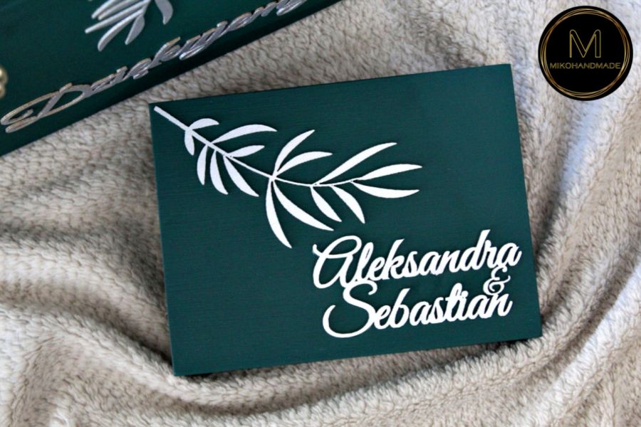 Pudełko na koperty, ozdobione srebrnymi liśćmi, oferuje bezpieczne i stylowe miejsce na przechowanie życzeń i kopert z prezentami od gości.