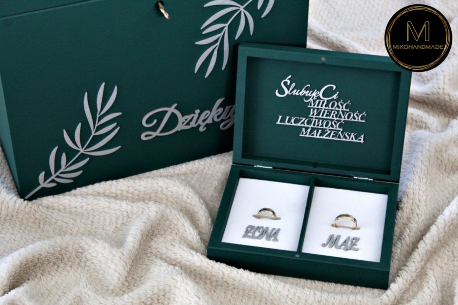 Dołączona do niego szkatułka na obrączki ze słowami przysięgi oraz napisami Żona i Mąż w estetyczny oraz elegancki sposób wyeksponuje Wasze obrączki ślubne tuż przed najważniejszym momentem ceremonii.