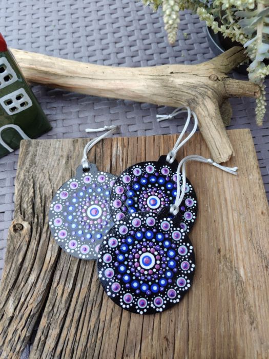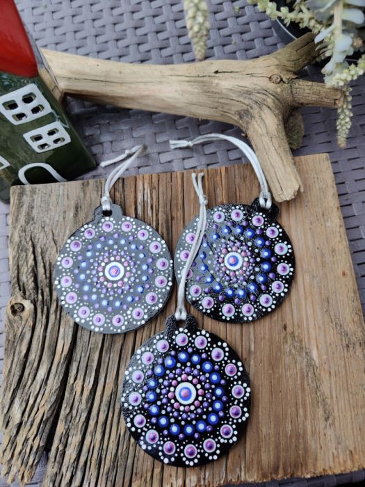 Ręcznie malowane bombki w stylu mandali to wyjątkowa ozdoba świąteczna, która doda blasku i artystycznego charakteru każdej choince. Każda bombka wykonana jest na czarnym tle, na którym precyzyjnie naniesiono misterny wzór z kropek w odcieniach fioletu, różu, bieli oraz błękitu. Tworzą one hipnotyzujący, symetryczny motyw mandali, który pięknie odbija światło i przyciąga wzrok.