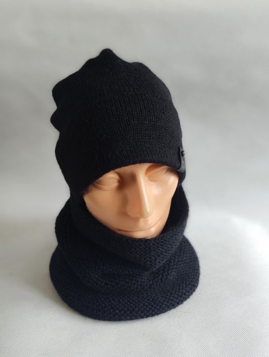 W skład zestawu wchodzi komin tuba i czapka o klasycznym fasonie, na szerokim podwójnym podwinięciu, dopasowującym się do kształtu głowy.