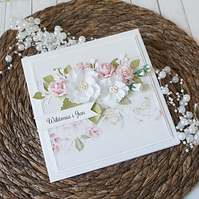 Komplet ozdobiony pięknym, eleganckim papierem polskiego producenta, dużym przestrzennym bukietem.