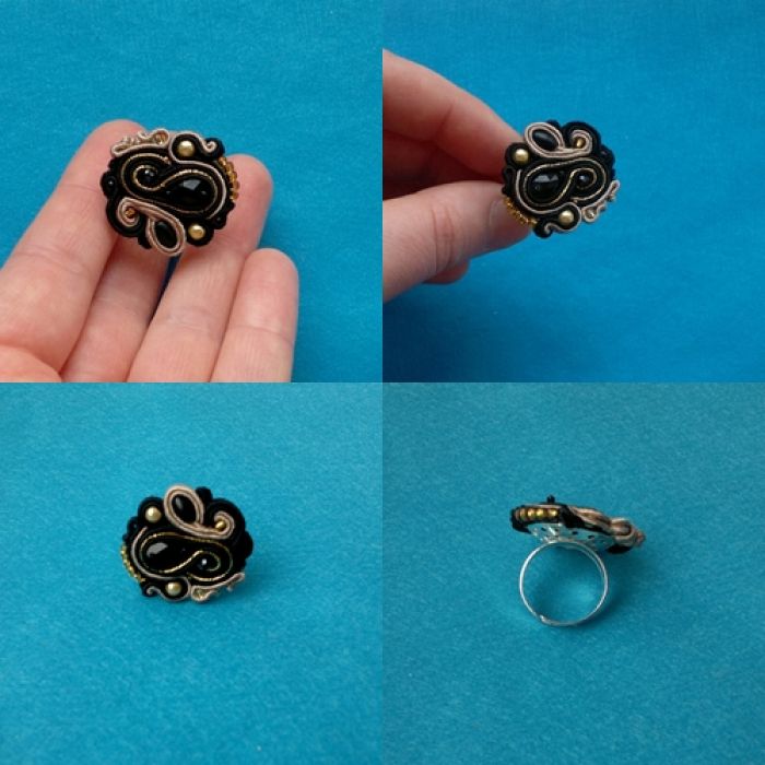 Pierścionek: baza metalowa w kolorze srebra, rozmiar regulowany, ozdoba sutasz zamocowana do bazy przy użyciu nici - żyłki przezroczystej. Rozmiar ozdoby 2,9 x 3,2 cm.