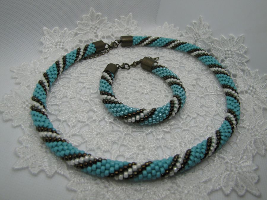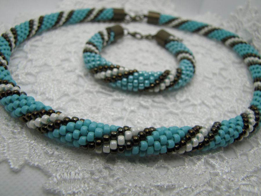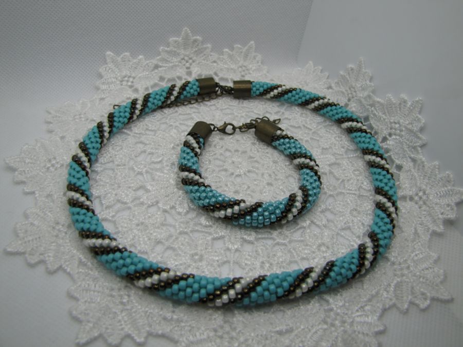 Komplet oryginalnej biżuterii szydełkowo-koralikowej w kolorze turkusu przeplatanego metalicznym ciemnym brązem i bielą. Wykonany z japońskich koralików Toho. Końcówki i zapięcie z metalu w kolorze antycznego brązu. Długość bransoletki z zapięciem 17,5cm + 4cm łańcuszka, naszyjnik 45cm + 6cm łańcuszka.