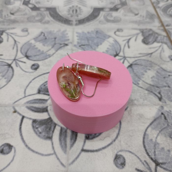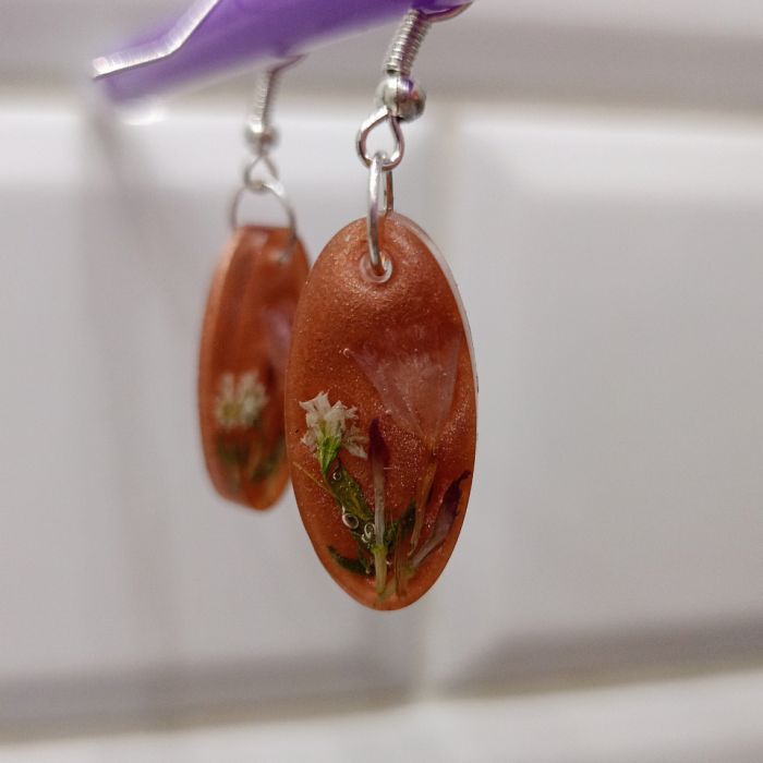 - Kolczyki wykonane ręcznie z utwardzonej żywicy epoksydowej, często z dodatkiem elementów dekoracyjnych (np. suszonych roślin, brokatu, drewna, pigmentów). Elementy metalowe (np. zawieszki, łańcuszki) są wolne od niklu lub wykonane ze stali nierdzewnej – w zależności od wersji produktu.