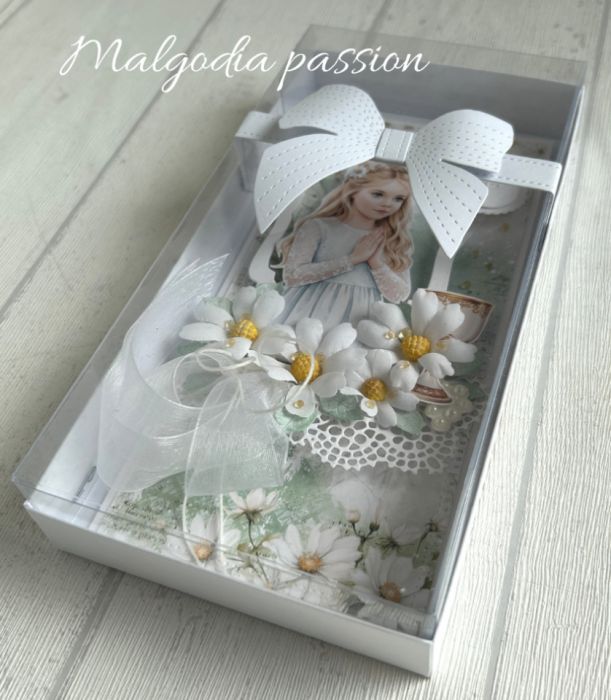 Piękna, ręcznie robiona kartka z wysokiej jakości materiałów papierniczych ozdobiona obrazkiem uroczej dziewczynki, perełkami , Hostyjką, ręcznie robionymi kwiatami i wstążkami. Wewnątrz ozdobione miejsce na wpis życzeń. Kartka w białym, dopasowanym pudełku z szybką ozdobioną kokardą.