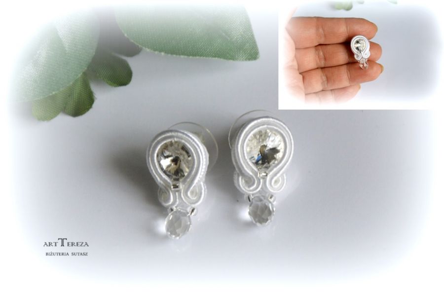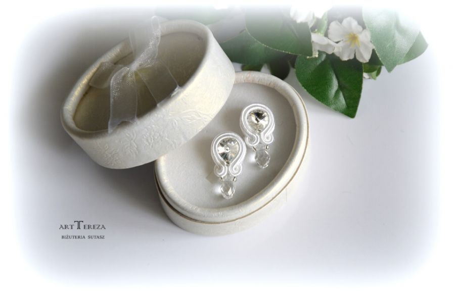 Malutkie kolczyki sutasz dla dziewczynki. Użyto kryształów rivoli i kryształów kropelek firmy Swarovski. Te małe cudeńka mogą być dodatkową śliczną ozdobą dla dziewczynki podczas uroczystości komunii świętej. Sztyfty posrebrzane. Kolczyki zaimpregnowane przed zabrudzeniem i wilgocią. Polecam, mogą być ślicznym oryginalnym prezentem. Pudełeczko wliczone w cenę.