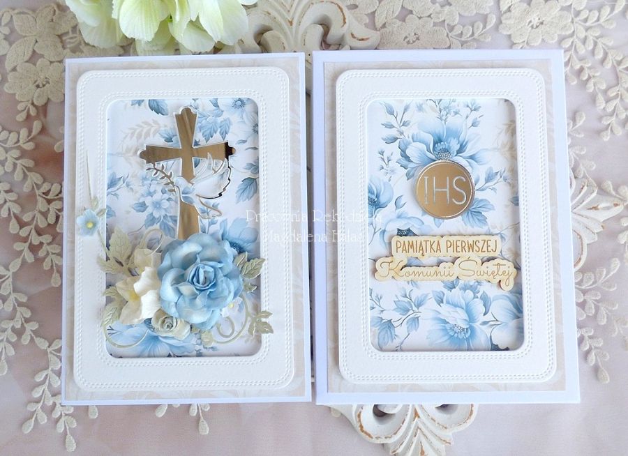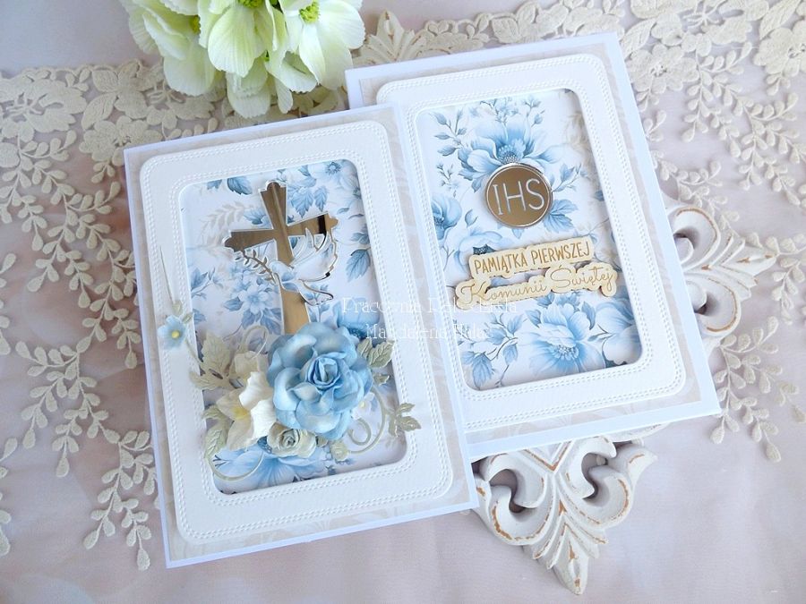 Warstwowa kartka komunijna, bogato zdobiona pięknymi papierami scrapowymi polskich producentów, dekorami z lustrzanej plexi, kwiatami oraz innymi dodatkami.