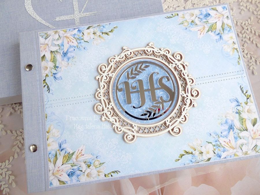 Ozdobiona jest pięknym papierem scrapowym polskiego producenta, laserowo wycinaną ażurową tekturką oraz Ihs-em ze srebrnej plexi.