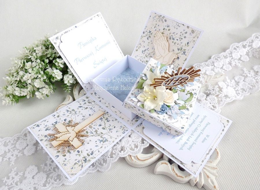 Pamiątka komunijna w formie rozkładanego pudełka - exploding box.