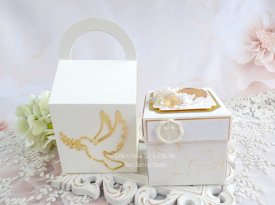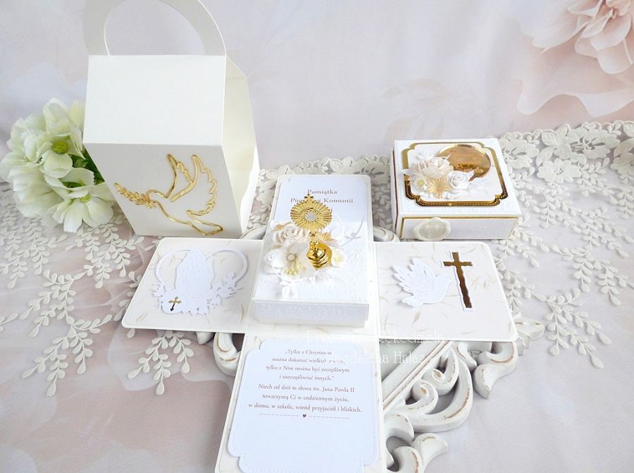 Komplet ozdobiony jest pięknymi papierami scrapowymi i tłoczonymi polskich producentów, dodatkami z lustrzanego złota, monstrancją w złotym kolorze, kwiatami, małym pudełkiem na pieniądze lub drobny prezent o wymiarach: 8x8x3,5 cm oraz innymi elementami zdobniczymi.