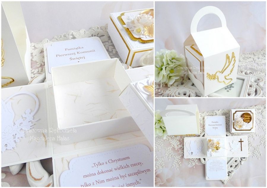 Pamiątka komunijna w formie rozkładanego pudełka - exploding box w torebce.