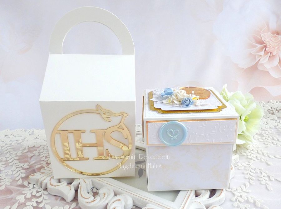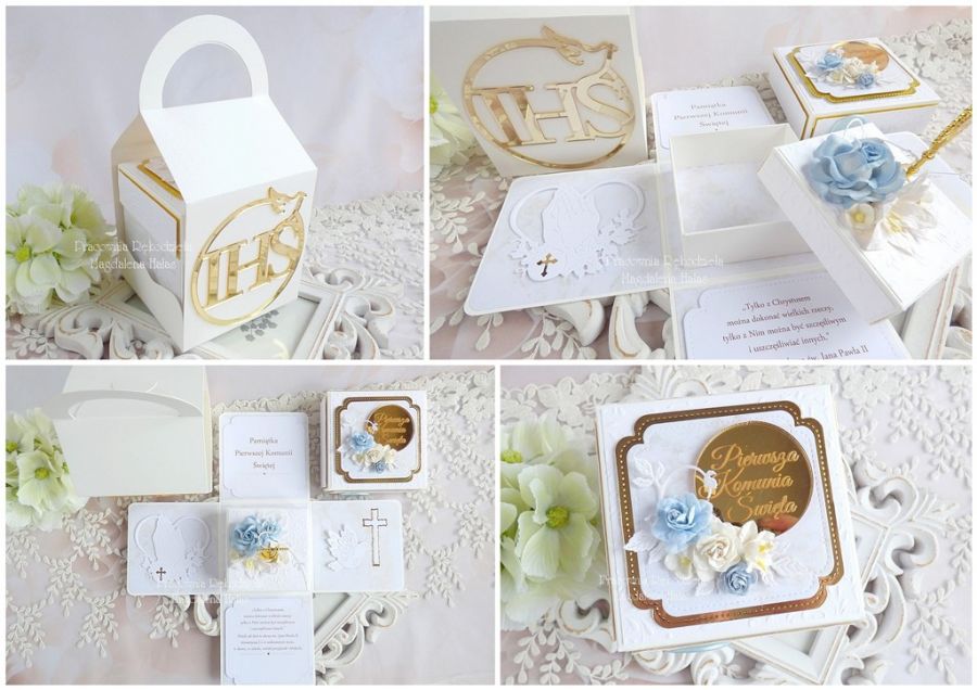 Komplet ozdobiony jest pięknymi papierami scrapowymi i tłoczonymi polskich producentów, dodatkami z lustrzanego złota, monstrancją w złotym kolorze, kwiatami, małym pudełkiem na pieniądze lub drobny prezent o wymiarach: 8x8x3,5 cm oraz innymi elementami zdobniczymi.