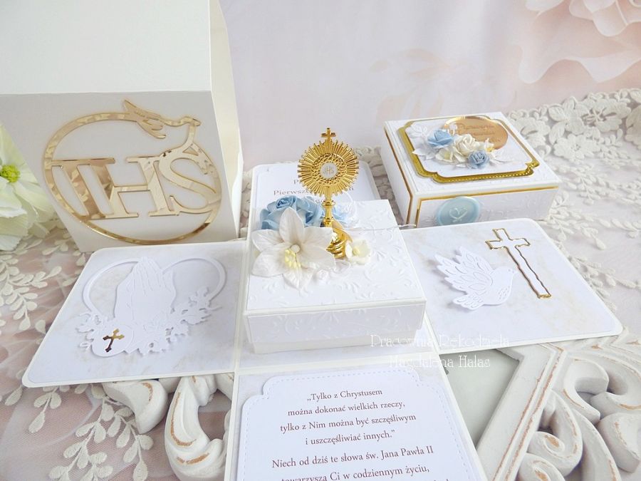 Pamiątka komunijna w formie rozkładanego pudełka - exploding box w torebce.