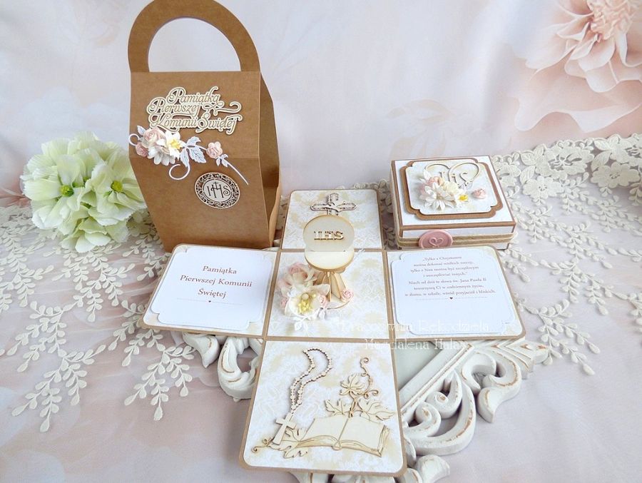 Pamiątka komunijna w formie rozkładanego pudełka - exploding box w torebce.