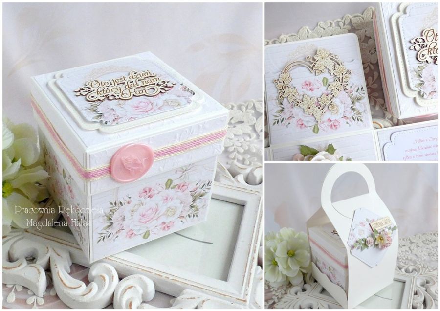 Komplet ozdobiony jest pięknymi papierami scrapowymi i tłoczonymi polskich producentów, laserowo wycinanymi tekturkami, kwiatami oraz innymi elementami zdobniczymi. Na ściance za sercem umieszczona jest kieszonka, która pomieści kilka banknotów.