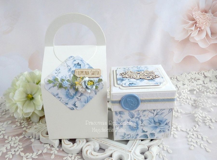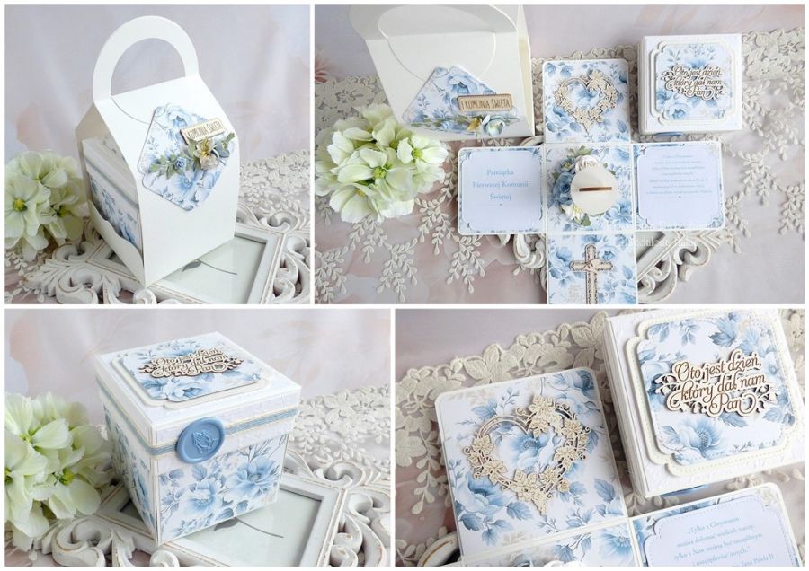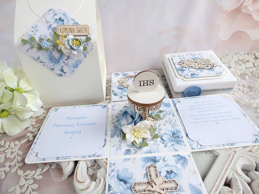 Pamiątka komunijna w formie rozkładanego pudełka - exploding box w torebce.