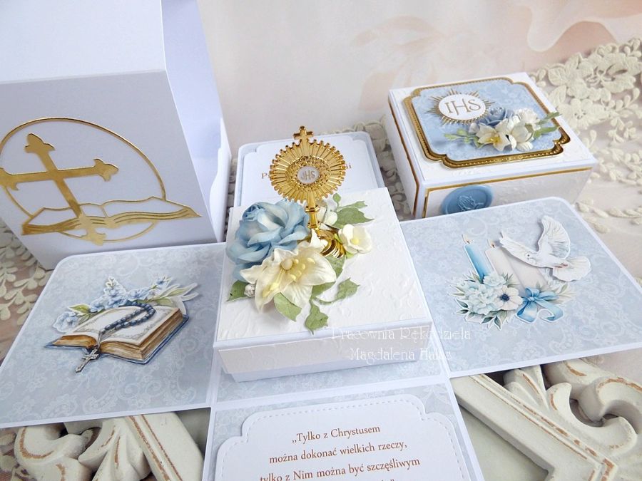 Komplet ozdobiony jest pięknymi papierami scrapowymi i tłoczonymi polskich producentów, dodatkami z lustrzanego złota, monstrancją w złotym kolorze, kwiatami, małym pudełkiem na pieniądze lub drobny prezent o wymiarach: 8x8x3,5 cm oraz innymi elementami zdobniczymi.