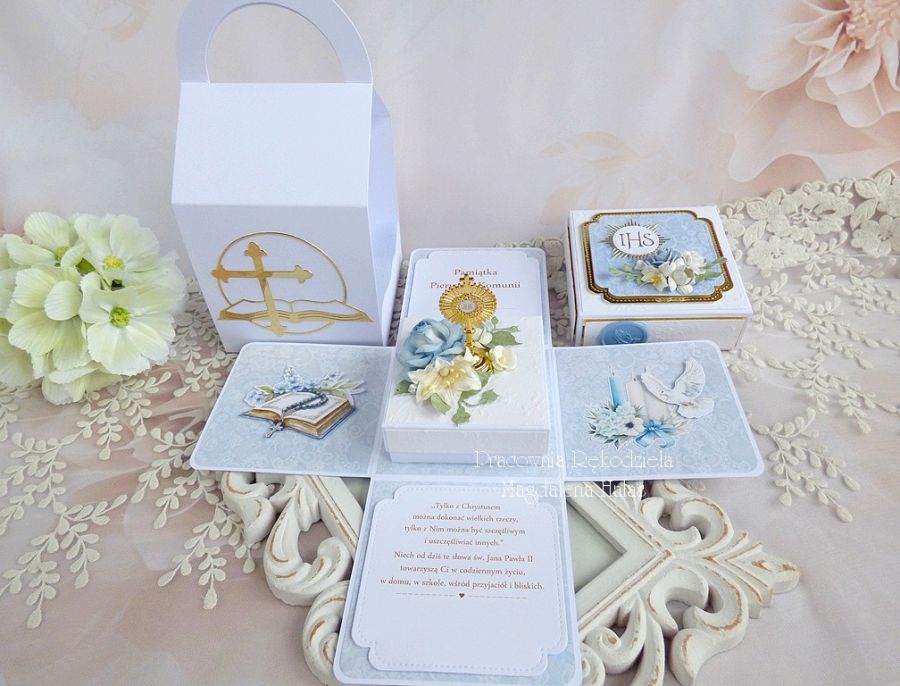 Pamiątka komunijna w formie rozkładanego pudełka - exploding box w torebce.
