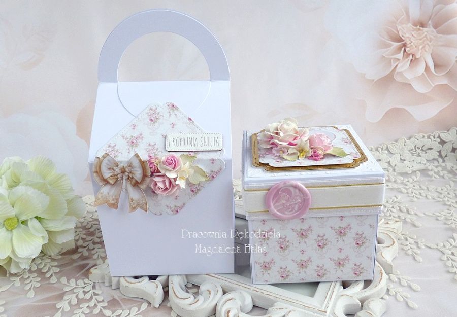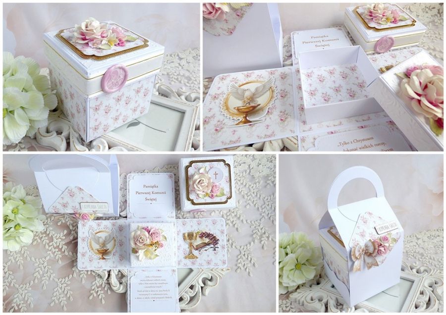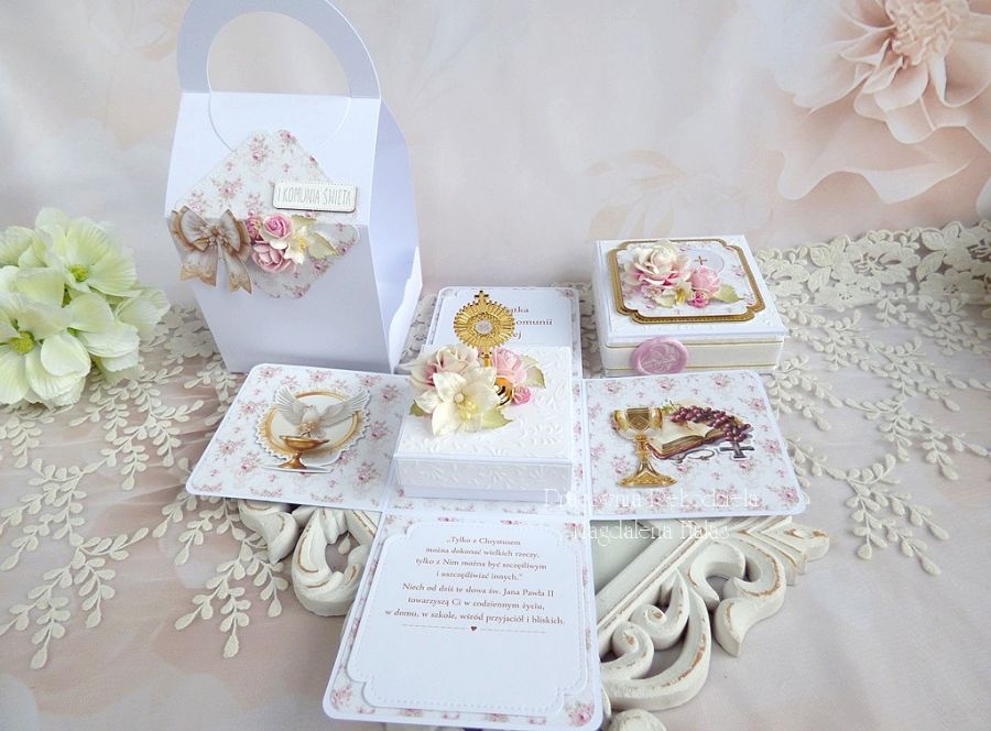 Komplet ozdobiony jest pięknymi papierami scrapowymi i tłoczonymi polskich producentów, dodatkami z lustrzanego złota, monstrancją w złotym kolorze, kwiatami, małym pudełkiem na pieniądze lub drobny prezent o wymiarach: 8x8x3,5 cm oraz innymi elementami zdobniczymi.