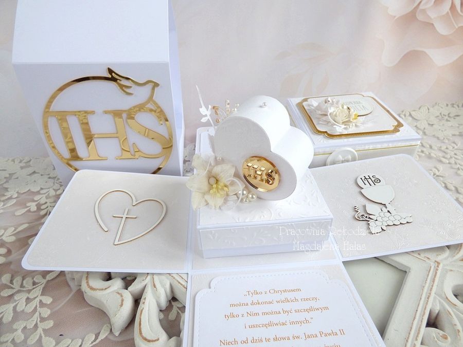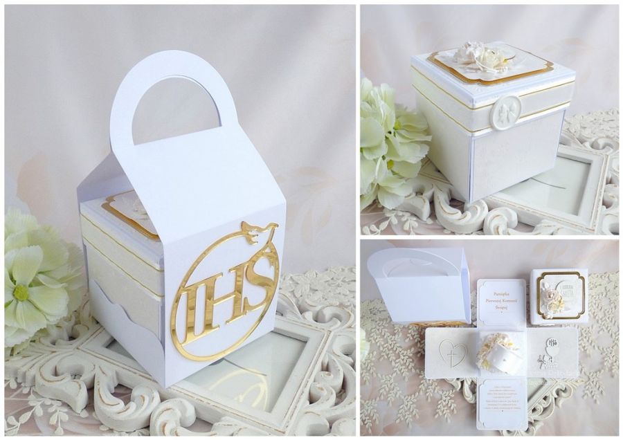 Pamiątka komunijna w formie rozkładanego pudełka - exploding box w torebce.