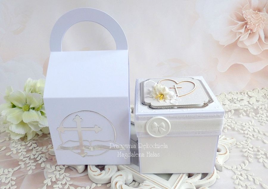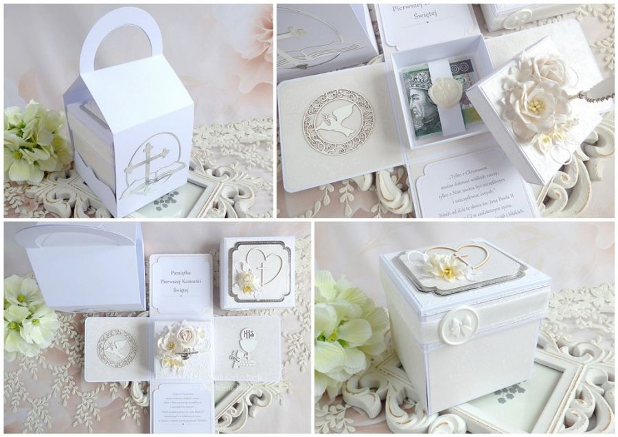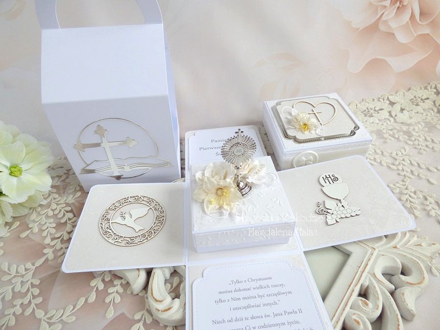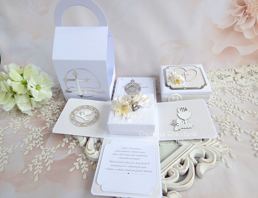 Komplet ozdobiony jest pięknymi papierami scrapowymi i tłoczonymi polskich producentów, laserowo wycinanymi tekturkami, monstrancją w srebrnym kolorze, kwiatami, małym pudełkiem na pieniądze lub drobny prezent o wymiarach: 8x8x3,5 cm oraz innymi elementami zdobniczymi.