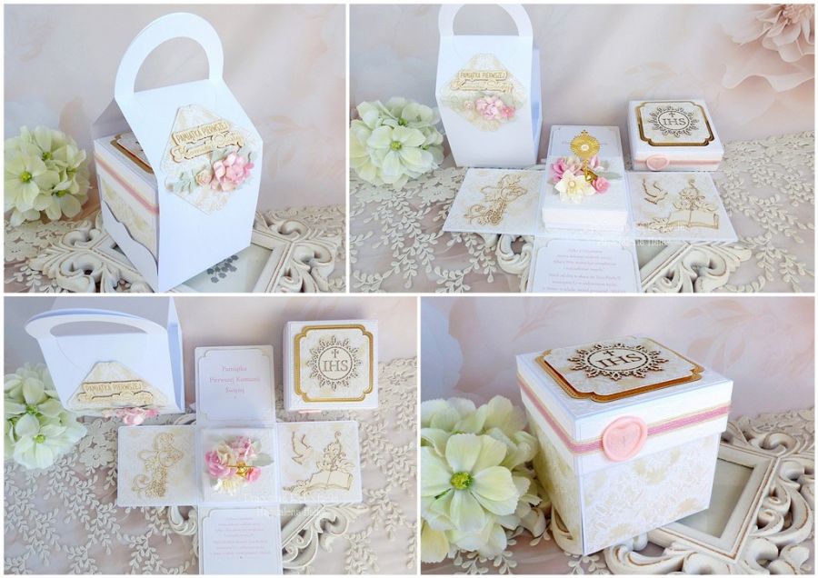 Komplet ozdobiony jest pięknymi papierami scrapowymi i tłoczonymi polskich producentów, laserowo wycinanymi tekturkami, monstrancją w złotym kolorze, kwiatami, małym pudełkiem na pieniądze lub drobny prezent o wymiarach: 8x8x3,5 cm oraz innymi elementami zdobniczymi.