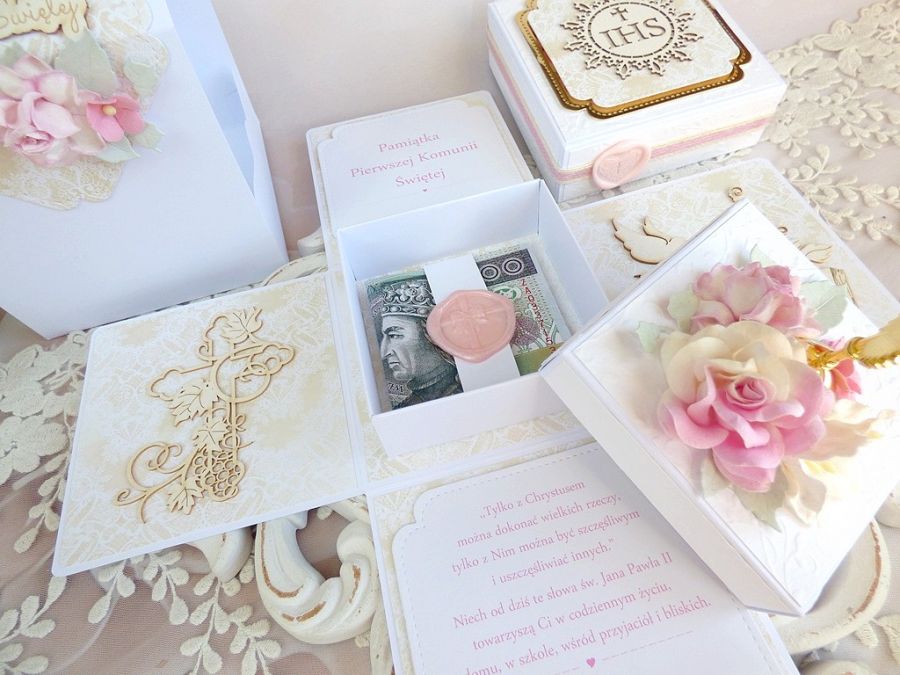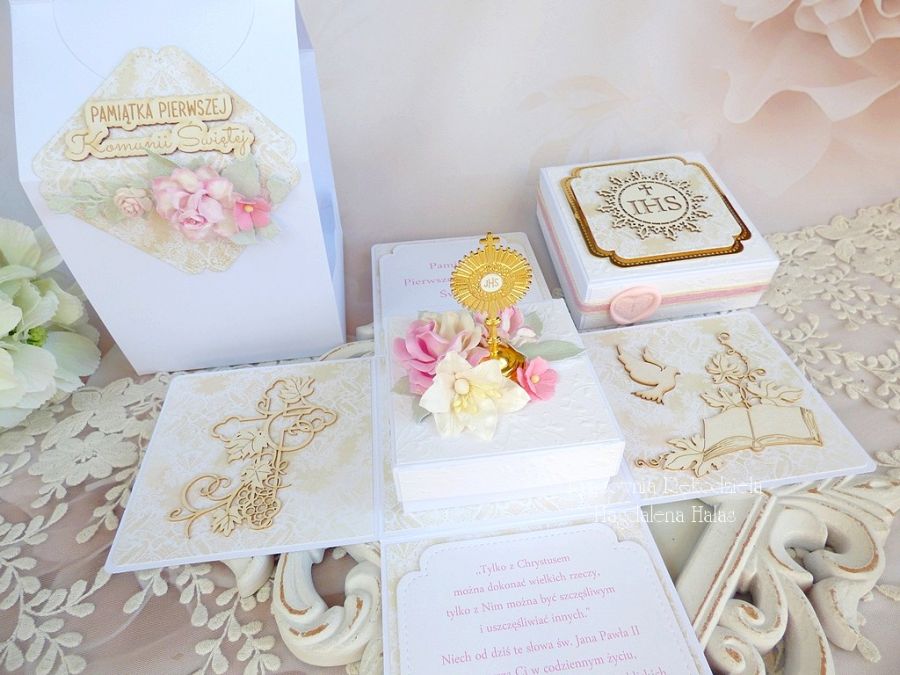 Pamiątka komunijna w formie rozkładanego pudełka - exploding box w torebce.