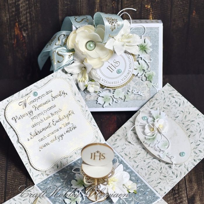 Wyjątkowy, oryginalny sposób na wręczenie prezentu komunijnego w gotówce. Pudełko wykonane z bezkwasowych papierów do scrapbookingu, ozdobione na wieczku okrągłym stemplowanym napisem, kwiatową kompozycją, szyfonową wstążką i sznureczkiem. Po zdjęciu wieczka pudełko otwiera się, ukazując cztery ścianki zdobione kolejno: stemplowanym tekstem pieśni, wycinanymi motywami Pisma św. i różańca, stemplowanym tekstem życzeń - wystarczy tylko dodać podpis - oraz panelem na wsunięcie banknotów. W centrum misternie wycinany kielich z Hostią z tekturki beermat ozdobiony kompozycją kwiatową.