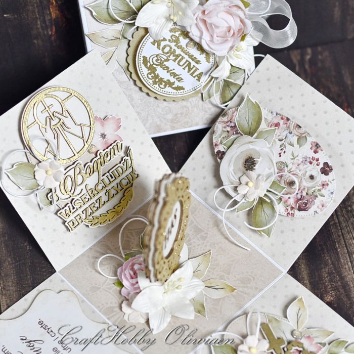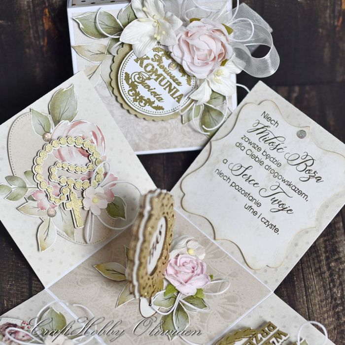 Wyjątkowy, oryginalny sposób na wręczenie prezentu komunijnego w gotówce. Pudełko wykonane z bezkwasowych papierów do scrapbookingu, ozdobione na wieczku okrągłym stemplowanym napisem, kwiatową kompozycją, szyfonową wstążką i sznureczkiem. Po zdjęciu wieczka pudełko otwiera się, ukazując cztery ścianki zdobione kolejno: motywami z warstwowej tekturki beermat, stemplowanym tekstem życzeń - wystarczy tylko dodać podpis - oraz panelem na wsunięcie banknotów. W centrum misternie wycinana monstrancja z Hostią z tekturki beermat ozdobiona kompozycją kwiatową.