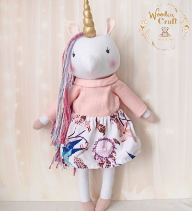 Przeurocza przytulanka, jednorożec, uszyty ręcznie z najwyższą starannością, ubrany w pudrowo-różowy sweterek i białą spódniczkę z motywem łapaczy snów. Wykonany ze 100% bawełny, wypełniony antyalergiczną kulką silikonową. Oczka malowane wodoodpornym markerem, włosy z cieniowanej włóczki, róg uszyty w miękkiej połyskującej tkaniny. Spódniczkę i sweterek można swobodnie zdejmować, posiadają gumeczki. Górne i dolne łapki układają się luźno, jednorożec siedzi z podparciem.