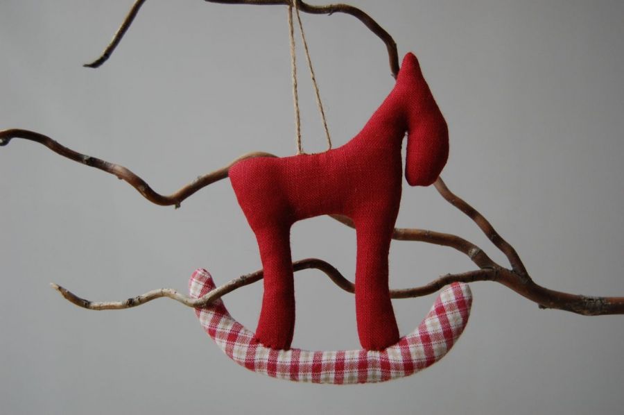 Konik na biegunach - może spełniać rolę choinkowej ozdoby lub świątecznej zawieszki niekoniecznie umieszczonej na choince. Wykonany z bordowej tkaniny bawełnianej - korpus i kraciastej - biegun. Zawieszka wykonana ze sznura jutowego.