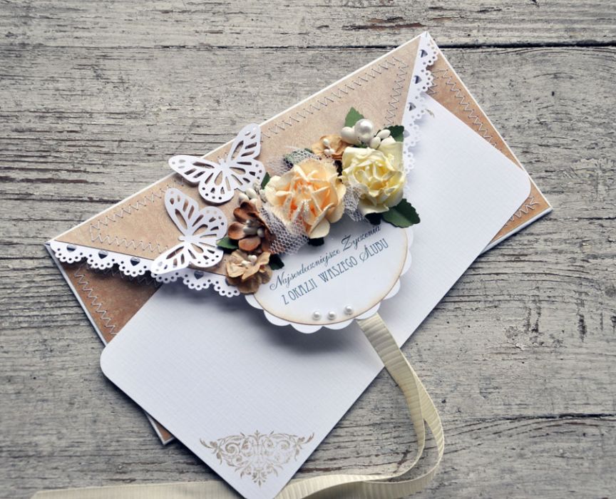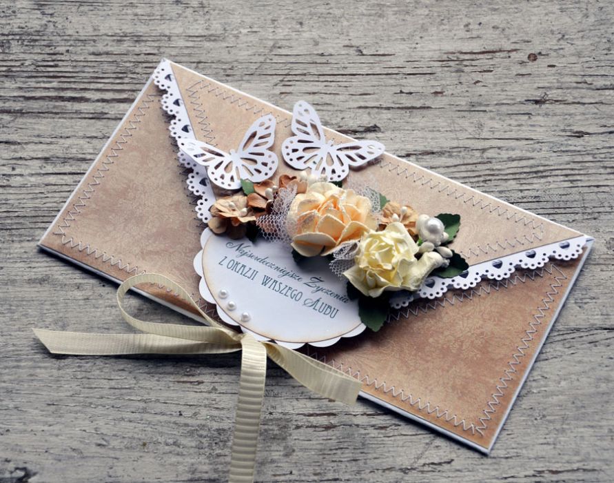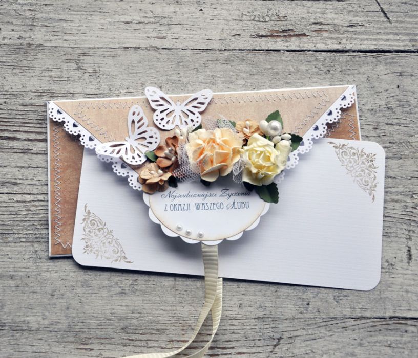 Piękna i wyjątkowa kartka ślubna w nietypowym kształcie-koperty, w której oprócz życzeń można umieścić prezent pieniężny; wykonana z papierów z perłowym połyskiem, ozdobiona szwami maszynowymi, papierową koronką, wstążką oraz kwiatami; w środku wkładka do wypisania życzeń; rozmiar 10x21; zapraszam