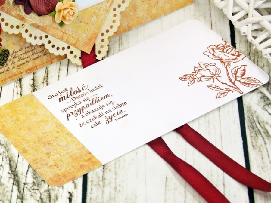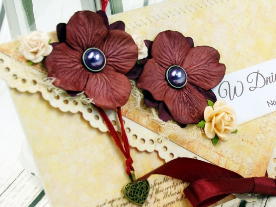 Elegancka kartka kopertówka wykonana z wysokiej jakości papierów do scrapbookingu, obszywana maszynowo. Kartka zdobiona papierowymi kwiatami oraz zawieszką z sercem. W środku wkładka na życzenia z cytatem.