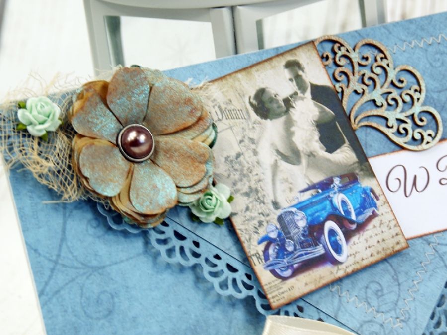 Elegancka kartka kopertówka wykonana z wysokiej jakości papierów do scrapbookingu, obszywana maszynowo. Kartka zdobiona papierowymi kwiatami oraz grafiką. W środku wkładka na życzenia z cytatem.