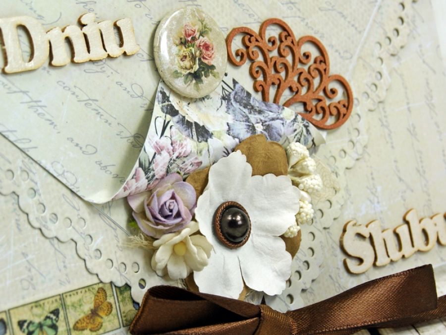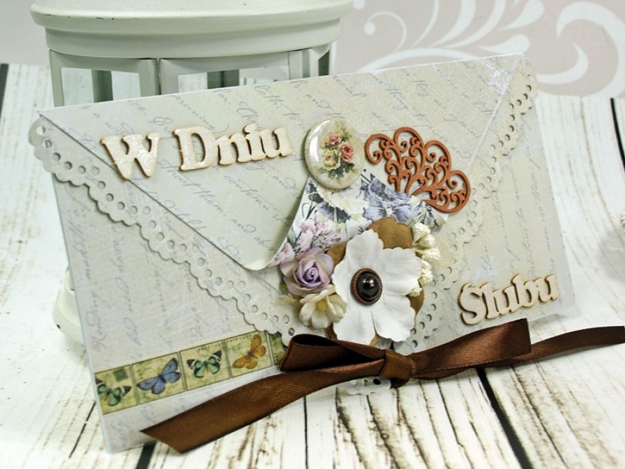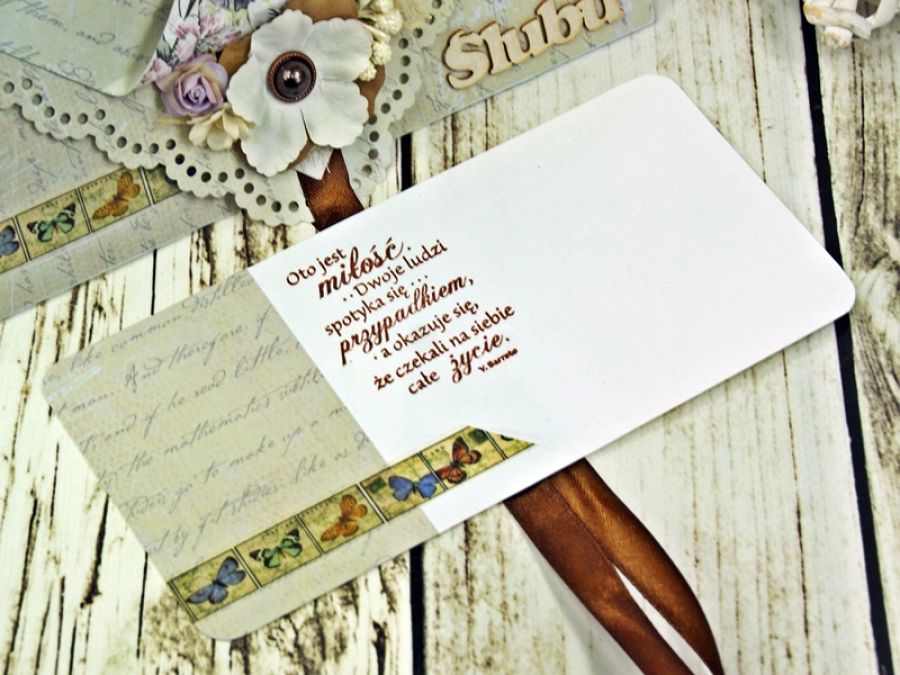 Elegancka kartka kopertówka wykonana z wysokiej jakości papierów do scrapbookingu, obszywana maszynowo. Kartka bogato zdobiona papierowymi kwiatami oraz motylami. W środku wkładka na życzenia z cytatem.