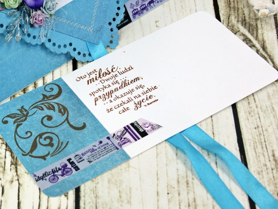 Elegancka kartka kopertówka wykonana z wysokiej jakości papierów do scrapbookingu, obszywana maszynowo. Kartka zdobiona papierowymi kwiatami oraz kryształkami. W środku wkładka na życzenia z cytatem.