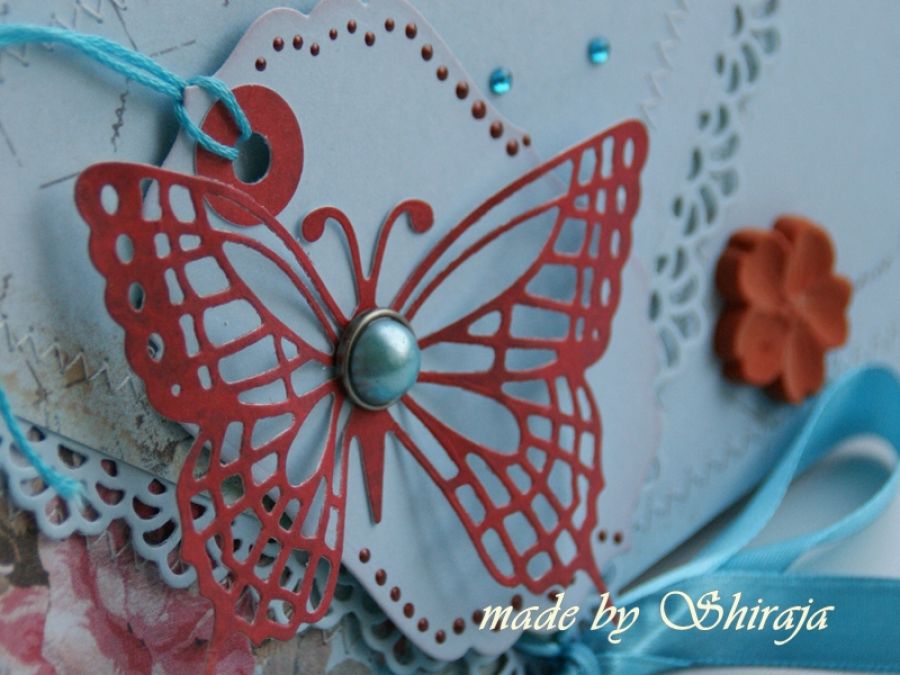 Elegancka i delikatna kartka kopertówka wykonana z wysokiej jakości papierów do scrapbookingu, obszywana maszynowo. Kartka ozdobiona kwiatuszkami z papieru oraz masy plastycznej.Uroku dodaje duży ażurowy motyl z perłowym ćwiekiem. W środku znajduje się wkładka na życzenia.