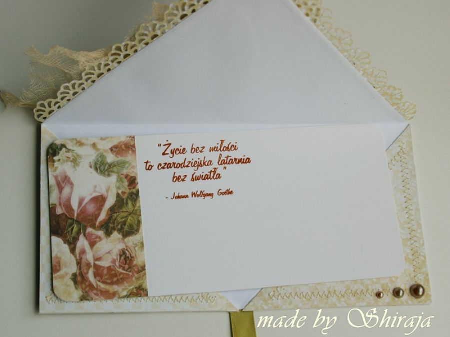 Kartka kopertówka wykonana z wysokiej jakości papierów do scrapbookingu, obszywana maszynowo. Odgięty rożek i róża dodają uroku i elegancji. W środku wkładka z cytatem.