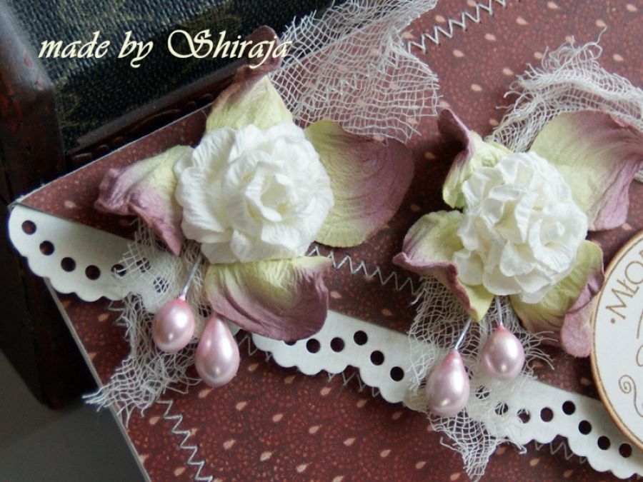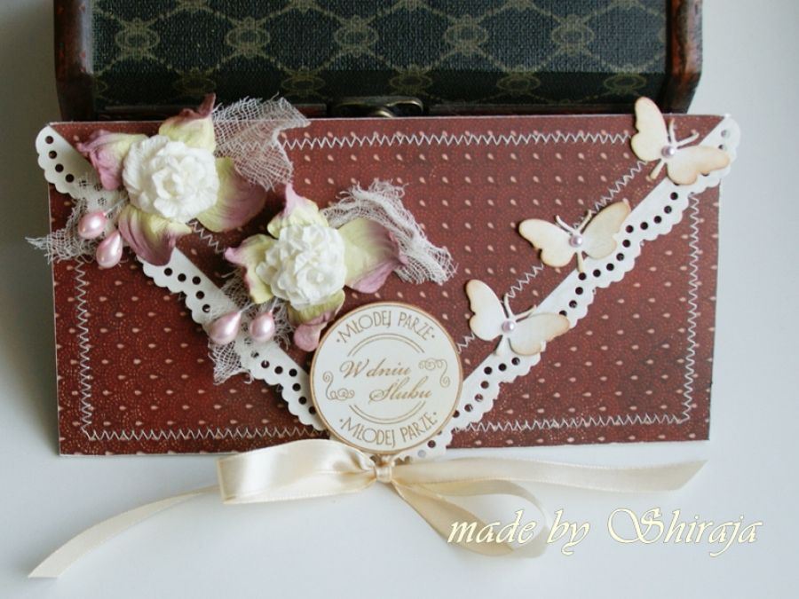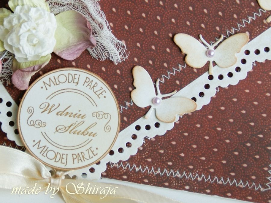 Elegancka i delikatna kartka kopertówka wykonana z wysokiej jakości papierów do scrapbookingu, obszywana maszynowo. Kartka ozdobiona papierowymi kwiatami, perełkami, oraz motylami W środku znajduje się wkładka na życzenia z cytatem.